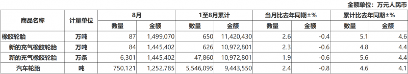 1-8月汽车轮胎出口量为555万吨,同比增长4.6%;出口金额为944亿元,同比增长4.1%。