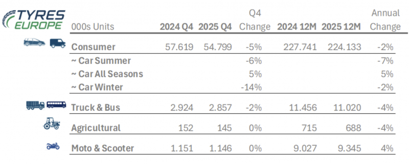 ETRMA秘书长表示,在消费品领域,销量下滑反映了持续的宏观经济压力:消费者信心低迷、行驶里程增长有限,以及全年进口轮胎渗透率上升。