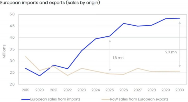 自2021年欧洲成为汽车净进口地区以来,其进出口平衡状况急剧恶化,2025年汽车贸易逆差已达160万辆。预计未来几年这一逆差将进一步扩大,到2030年将增至230万辆。由此引出两个显而易见的问题:这些进口车来自哪里?出口又为何陷入停滞?